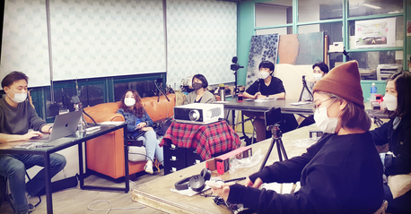 도시 명상_익숙하지만 낯선 1차시는 미디어라이브러리에서 시작한다. 참가자들은 큰 원을 그리며 놓인 작은 원형 카펫 위에 앉아서, 탄천의 풍경을 무음으로 감상한다. 평소에는 익숙한 탄천이지만 특별한 구도, 시선으로 기록된 탄천은 낯섦으로 다가온다. 익숙한 탄천의 낯선 구간, 복정역 탄천이 앞으로 우리 수업에서 영상을 촬영하게 되는 로케이션이 된다. 1) 미디어가이드와 복정역 탄천 by 이계원(시각작가/알투스통합예술연구소 대표) 도시 명상_익숙하지만 낯선 1차시는 대면수업, 나머지 2개 차시는 비대면수업으로 이루어지